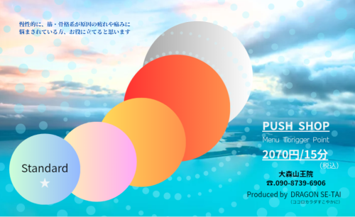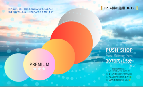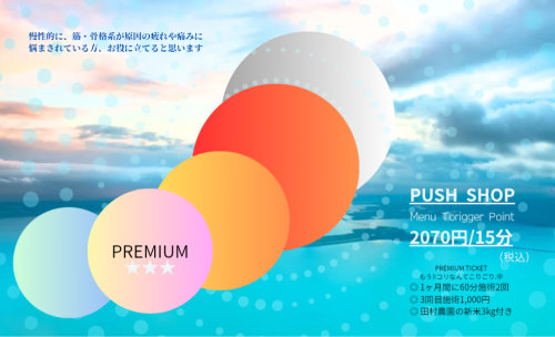 肩こり、首こり、腰痛、肩関節、膝、頭痛、ヘッド、浮腫みなど、1番気になる箇所を含めたその周囲の3部位を施術いたします。